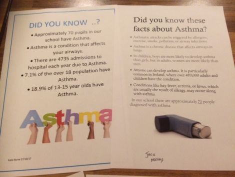 - Asthma Awareness: For their CSPE Action Project, 3rd year Class Connolly worked on the important issue of Asthma Awareness throughout the whole school community. They researched Asthma, carried out student and staff surveys and designed information leaflets and posters about Asthma for the school. Thanks to their efforts, St. Farnan's was awarded a Silver Asthma Awareness Award by the Asthma Association of Ireland in November 2017 - Click here for more info.